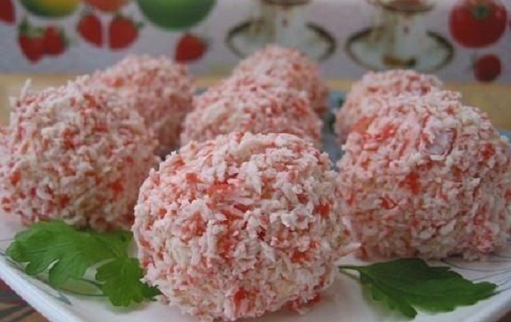 3. В небольшую тарелку потереть на мелкую терку крабовые палочки. Мокрыми руками брать немного сырной массы, сформовать "лепешку", в серединку положить оливку (можно фаршированную). Скатать шарик, обвалять в крабовых палочках.