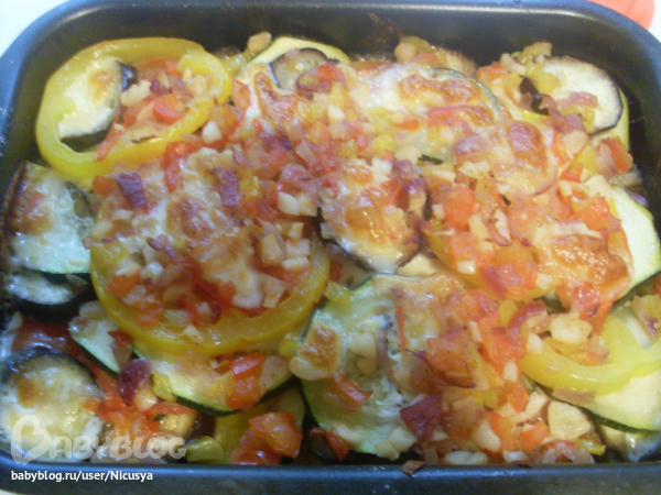 Порезала на кольца баклажан, кабачок, помидорки, перчик, лучок. Посолила, поперчила. Все сложила в форму для запекания, добавила адыгейского сыра, обернула фольгой и... В духовку!