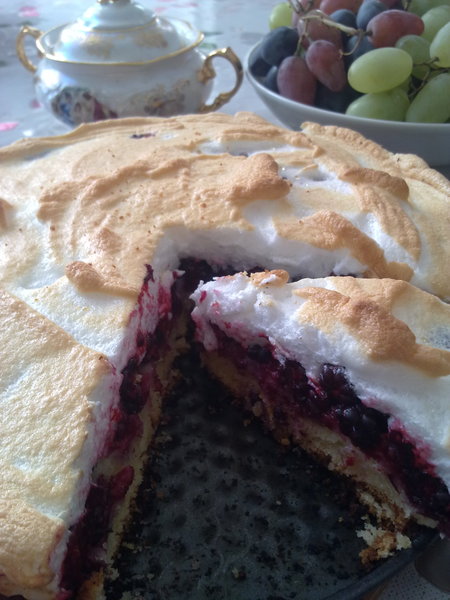 2. пока печется корж взбить 3 белка с 100 гр сахара и выкладываем на корж сперва ягоды а потом взбитые белки.