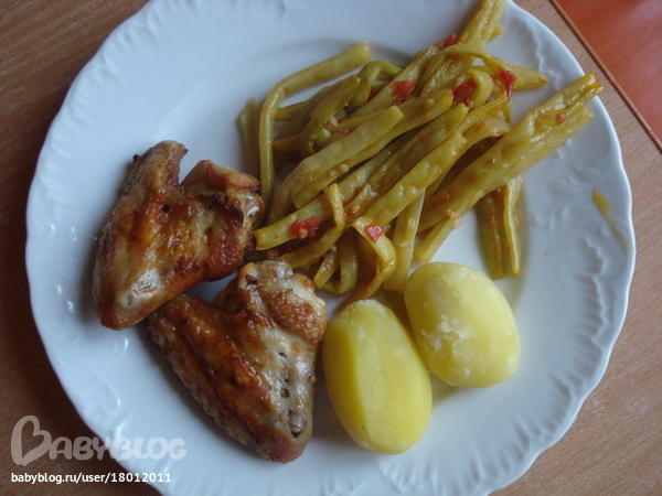 На гарнир----картофель и фасолька спаржевая жареная. Было вкусно!