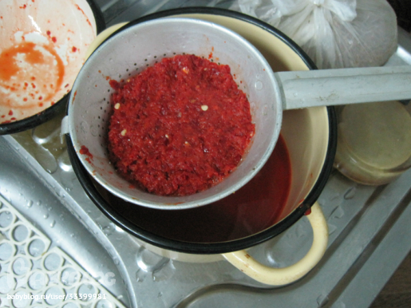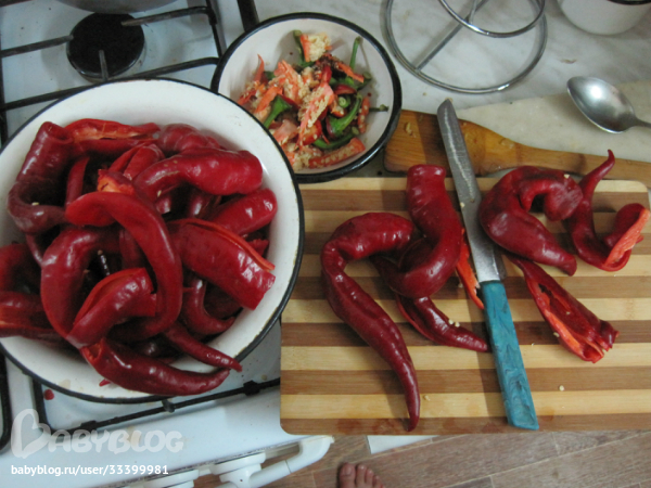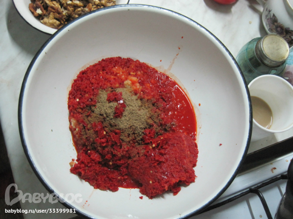 Тут есть болгарских перец, но нет семян укропа. Тетушка делает с семянами укропа и с болгарским перцем. Перец перемалывает весь, закладывает в навлочку, завязывает и подвешивает на ночь стекать. С него очень много жидкости выходит. Вкус получается более нежный.