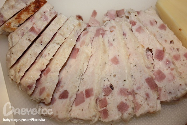 Блюда из птицыСлучайно увидела по тел. рецепт и захотелось сделать, тк..был прост..пол кило филе куриного, 150гр ветчины,я брала подкопченую, добавить соль,перец, полстакана молока, можно например оливки или маслинки положить, 1ч.л. крахмала, в молоке развести..можно зеленухи добавить,короче кто что любит,перемешать все..будет жидковат фарш..но ничего..я выложила в миску для запекания на фольгу и фольгой закрыла, выпекать минут 40, резали как тортик,когда горячий был и кушали с картошечкой,оч. вкусно..потом охладилось и как рулет куриный на завтрак)) приятного аппетита