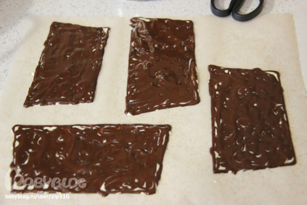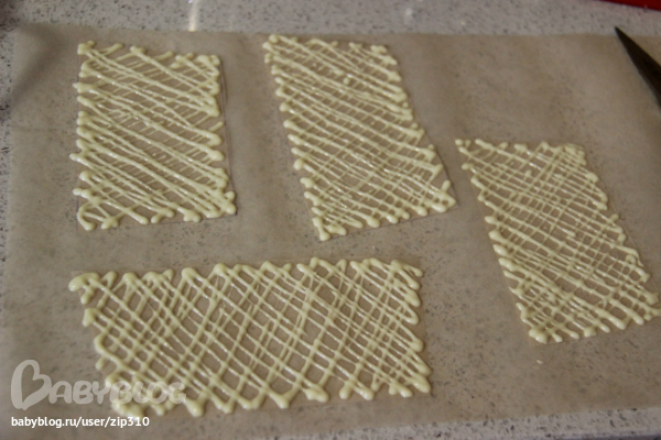 Из бумаги для быпечки вырезала основу для будущих бортиков. Помня мой неудачный опыт с российским белым шоколадом, купила нормальный швейцарский, который замечательно растопился. Из пакетика нанесла белый шоколад на бумагу:
