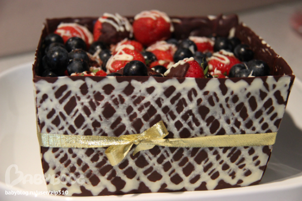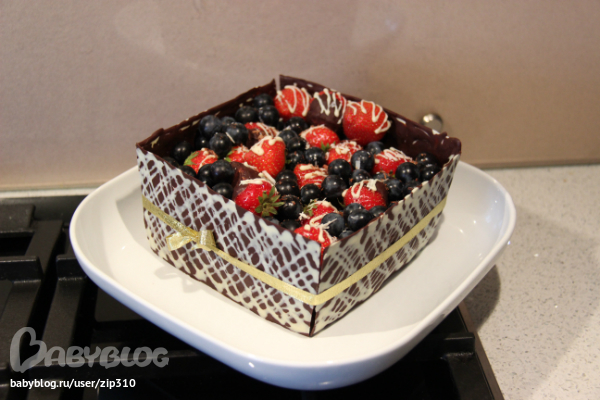После того, как все хорошо застыло, слегка обрезала корж по бокам, чтобы был ровнее, намазала бока растопленным шоколадом и прижала готовые бортики. Завязала сначала ниткой сверху и снизу - и в холод. Потом уже перевязала лентой.