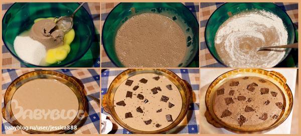 Вылить смесь в форму, сверху разложить кусочки шоколада.