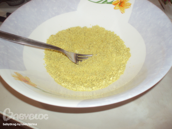 1) Все кубики раздавить вилкой в миске (для слабонервных: кубики НИКОГДА и НИ КУДА не добавляю, решила попробовать сделать с ними сало, потому что КАКОЙ дали рецепт, ТАКОЕ и сделала!!! И не надо мне рассказывать, что КУБИКИ - ЭТО ЗЛО, я и без вас это знаю!!! )