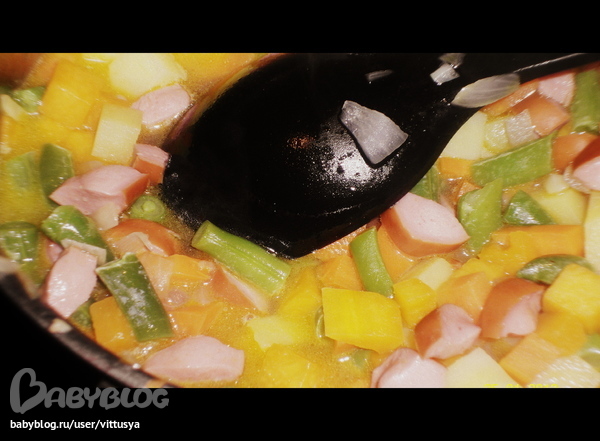 На смеси оливкового и сливочного масла обжарила сосиски, лук,чеснок и остальные овощи, порезанные кубиком, и стручковую фасольку
