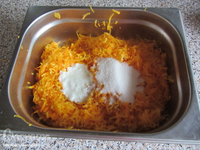 Купила килограммовую тыкву, почистила, удалили семена и натёрла на тёрке