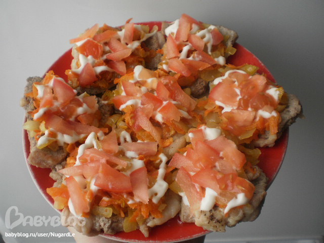 Блюда из мясаМуж просто обожает , когда рыба или мясо , приготовлены под овощами ) . И , вот что я готовила на выходных ( это вид , до протушивания в микроволновке