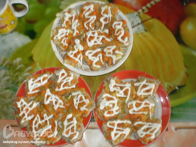 Обжариваем до полуготовности ( НЕ пережариваем ) с обеих сторон , укладываем сверху , заранее обжаренные лук и морковь :