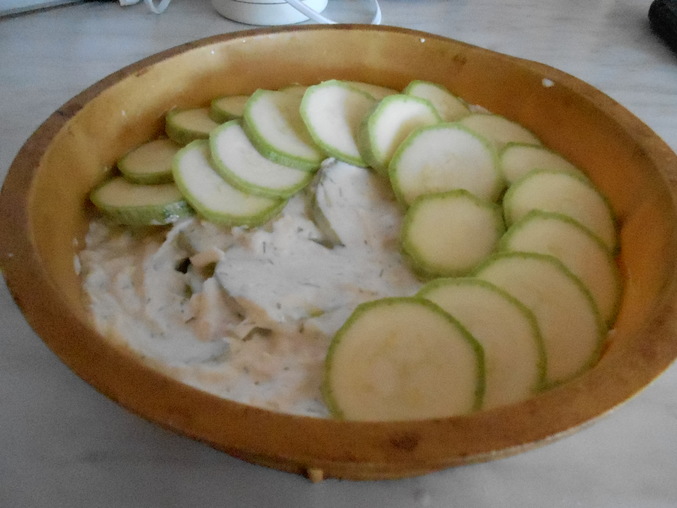 В форму выкладывает слой кабачков, поливаем соусом. Еще слой кабачков и соус. Сверху сыр. В духовку на 35-40 мин.