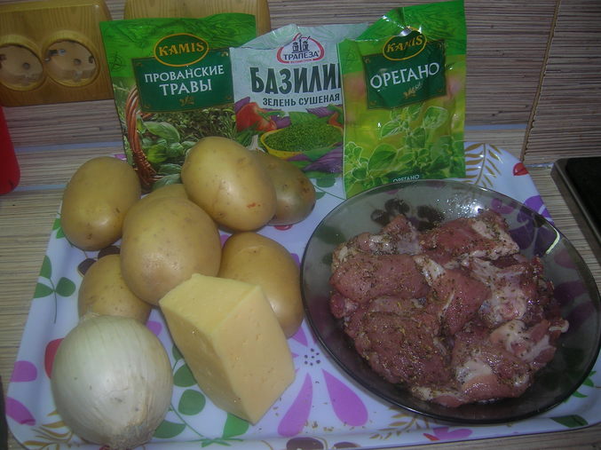 Предварительно подготовим мясо. Его необходимо порезать на кусочки, при желании можно отбить. Посыпать солью и специями, хорошо перемешать и оставить постоять, пока будут подготавливаться остальные ингредиенты для мяса по-французски. Специи выбираем те, которые вам больше всего нравятся. Мясо хорошо сочетается с базиликом, орегано, перцем. Можно взять готовый набор специй для мяса по-французски.