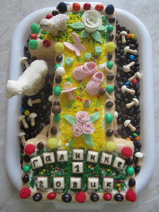 Первый опыт с мастикой. Маленькую овечку делала сама( у меня ж Галюня овенчик по гороскопу), плохо вышло, большая покупная. Грибочки тоже покупные, остальные фигурки сама делала. Поднос размером 40х30, высота 7-8см , не взвесила, но кг 3 будет