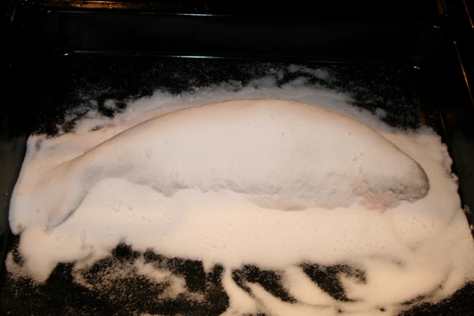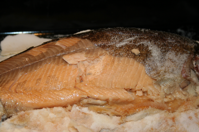 Знач так)) У меня была речная форель, промыла, и уложила на подушку из соли, см.2-3 соли, сверху засыпала, обильно. И в духовку на 40-50 минут. Можно прежде чем засыпать солькой, поперчить, во внутрь положить лаврушку и сочком лимона сбрызнуть.