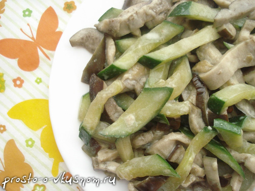 Баклажаны обжариваем, остужаем, соединяем с огурцами и добавляем заправку. Все!