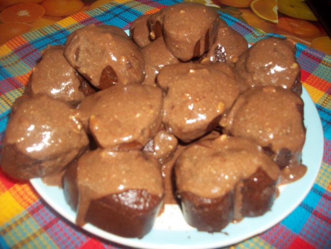 Затем глазурь:200 гр. слив.масла растопить,добавить 2-3 ст.л сахара,3 ст.л.какао,перемешивать до полного растворения.Затем 5 ст.л.сметаны,размешать и не доводя до вскипания снять с огня.Горячие пирожные обливать глазурью и посыпать орешками!!!