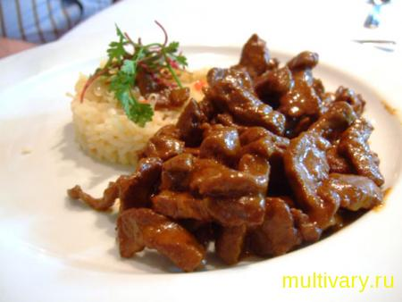 Ингредиенты: Мяса - 600 граммов нарезанного тонкими длинными кусочками Лука репчатого - 1 головку Томатной пасты - 2 столовых ложки Сметаны - 3 столовых ложки Муки - 1 столовую ложку Черного перца, соли и лаврового листаРецепт:Во-первых, не забудьте поставить режим «Тушение».(для мультиварке панасоник)