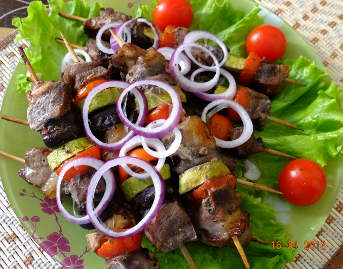 Мини-шашлычок из куриных сердечек и свинины с овощами, маринованный в кисло-сладком маринаде...)))