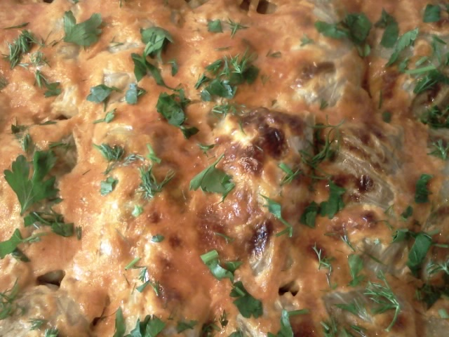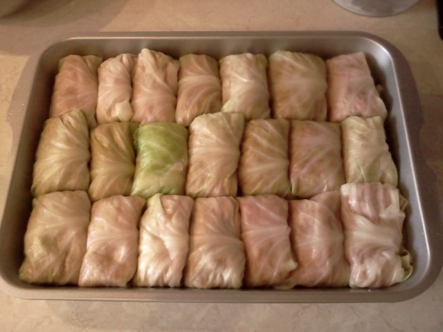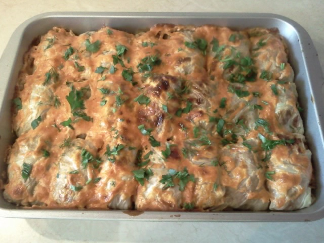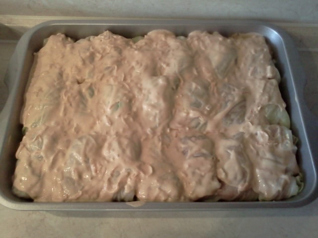 Делаем как обычные голубцы,далее заливка:сливки+кетчуп+горчичный соус(немного) и запекаем в духовке 40мин.Посыпаем зеленью и все!Приятного аппетита!!!