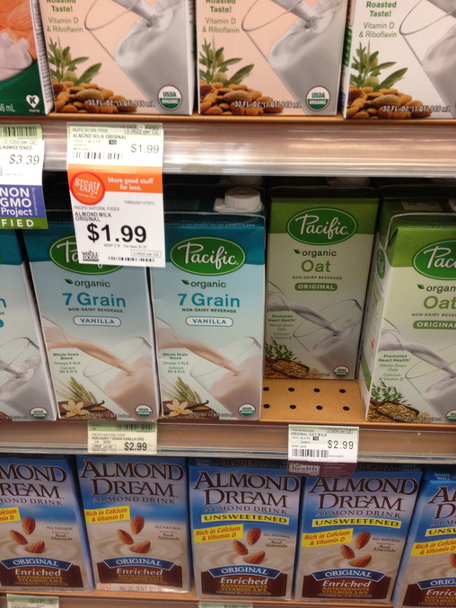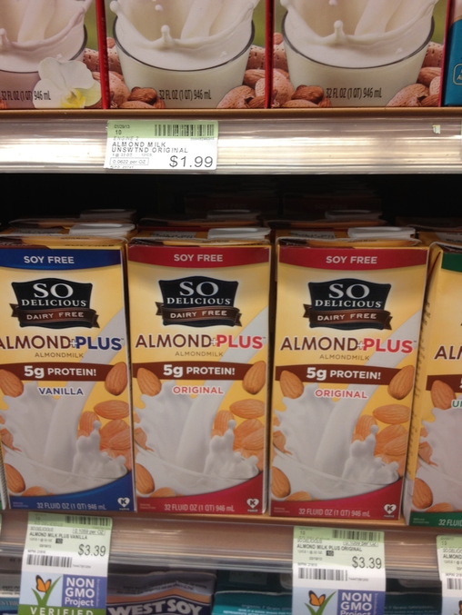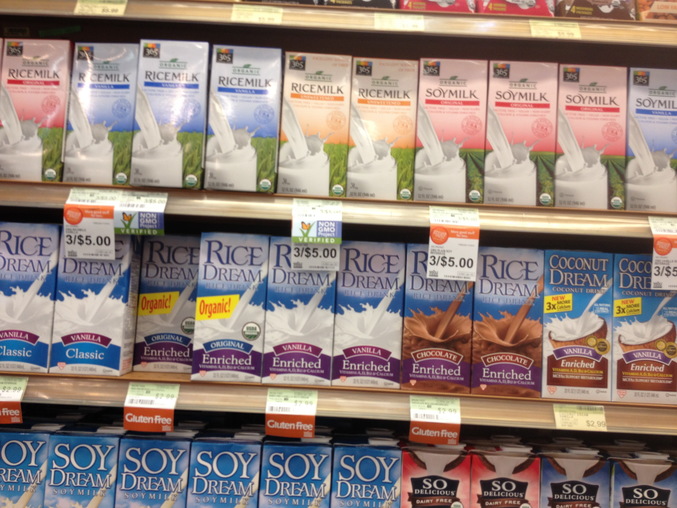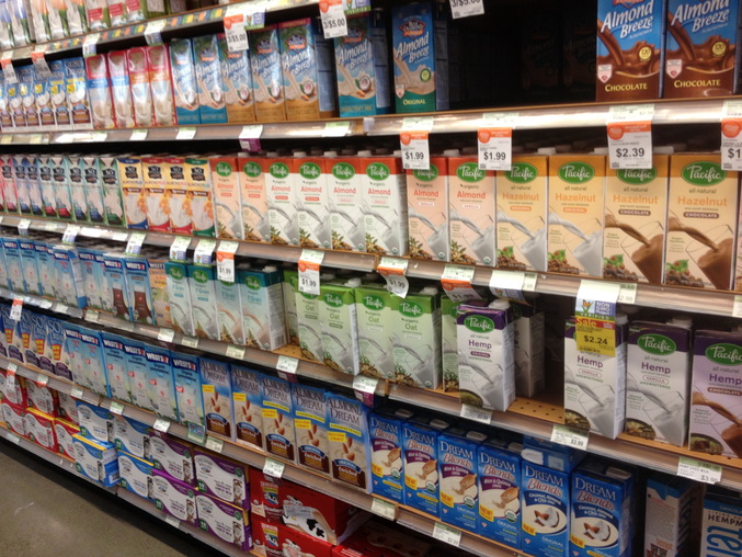 Миндальное сладкое и не сладкое шоколадное, обычное и ванильное молоко. Внизу рисовое и соевое.