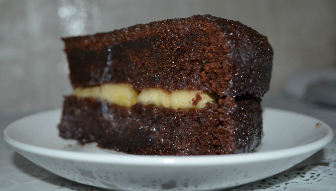 Просеять все сухие ингредиенты через сито в отдельную емкость (мука, сода, разрыхлитель, какао). Яйца взбить с сахаром и ванильным сахаром до растворения крупинок. Добавить во взбитую массу растительное масло и молоко, смешать миксером, добавить просеянные сухие ингредиенты, все тщательно перемешать. Добавить кипяток . Размешать. Тесто будет очень жидким. Выливаю в кастрюльку мультиварки (ничем не смазываю). Ставлю режим Выпечка 65 минут. После сигнала ставлю еще 20 минут выпечки. После этого оставляю в кастрюльке мультиварки с закрытой крышкой минут на 20-30 для остывания. Разрезала на 2 коржа, смазала сгущенкой, выложила в середине бананы. Сверху тоже все сгущенкой промазала.