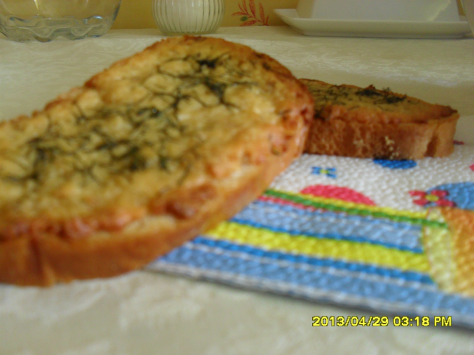 Теперь гренки: смешать мягкое сливочное масло + горчица + чеснок,пропущенный ч/з пресс + тертый сыр.Этой смесью намазываем белый хлебушек,(потом сверху я посыпала укропчиком) и выкладываем на противень(я на решетке делала)и отправляем в духовку на 20 минут при 170 С до подсыхания и зарумянивания(я держала дольше,подсох хлебушек как надо).