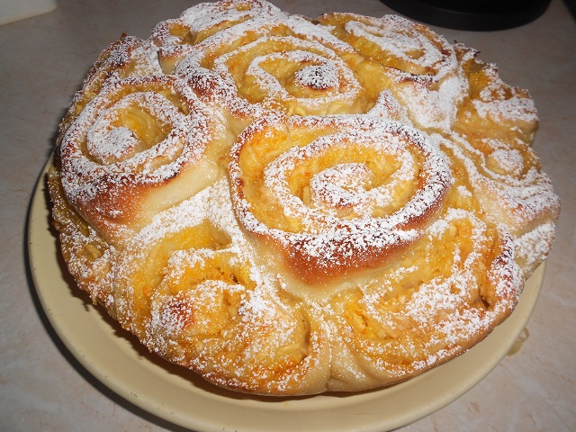 Тесто раскатать, выложить тонким слоем начинку, свернуть в рулет, нарезать столбиками (~ по 7 см ) Столбики поставить в смазанную маслом форму, оставить в тепле, чтобы тесто подошло. Выпекать 40-45мин при t 200-220˚ .