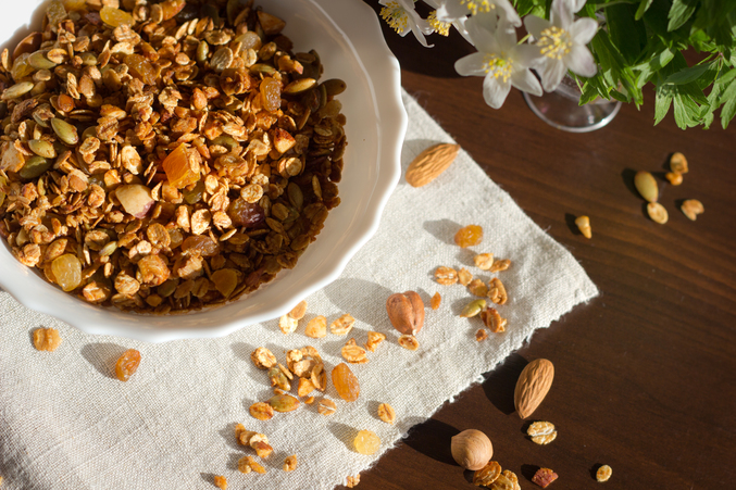 Диетические блюдаЭто домашние мюсли, смесь злаков и орехов, запеченных до хрустящего состояния, приготовленные из тех составляющих, которые любите именно вы. Их не сравнить с магазинными. Можно добавлять любимые орехи и сухофрукты, семечки, шоколад, кокосовую стружку, кунжут, в общем все, что пожелаете. Это замечательный завтрак, очень вкусный и полезный:)