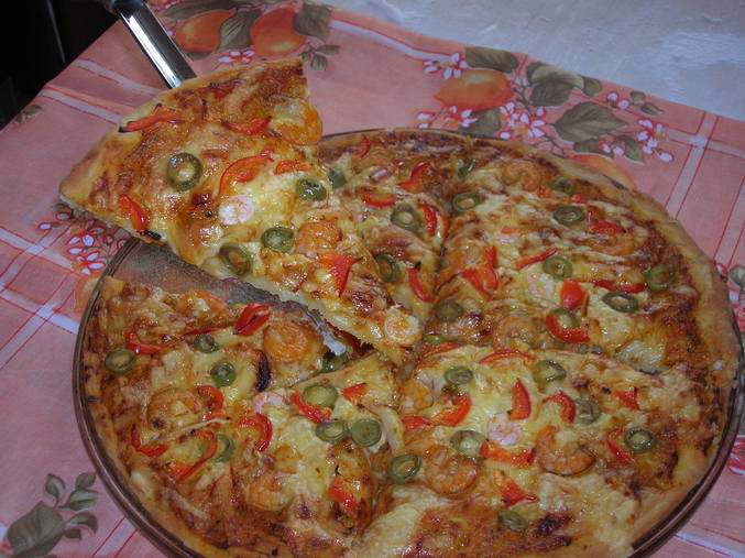 Пицца с креветками: сыр, креветки, болгарский перец, зеленые оливки.