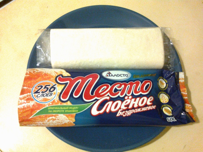 3. Тесто. Кому интересно, покупаю вот такое. Всегда его беру - хорошее качество, быстро выпекается. Советую! )) Там когда разворачиваешь получается прямоугольник. Вот я делила его на 3 части и запекала.