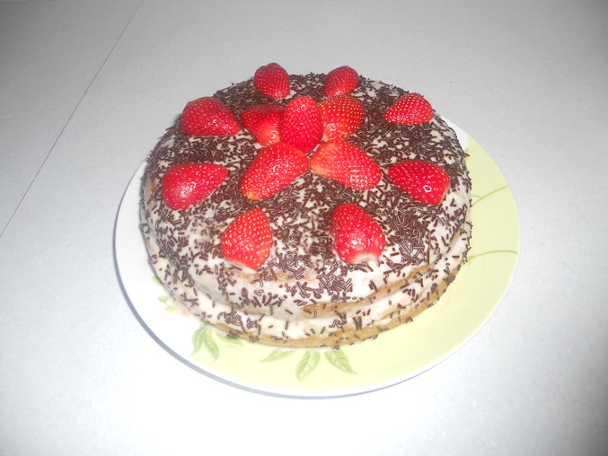 5. Разрезаем на две части и смазываем кремом, соединяем две половинки и смазываем сверху оставшимся кремом. Посыпаем тертым шоколадом и украшаем клубникой.