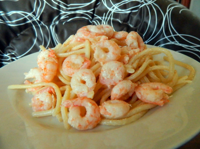 А я обжариваю креветки в чесночном масле (т е сначала чесночок обжаривается, вынимается, получается чесночное масло), с морковкой натертой и заливаю сливками и только когда потушится этот "соус" добавляю спагетти (а еще лучше лапшу удон)