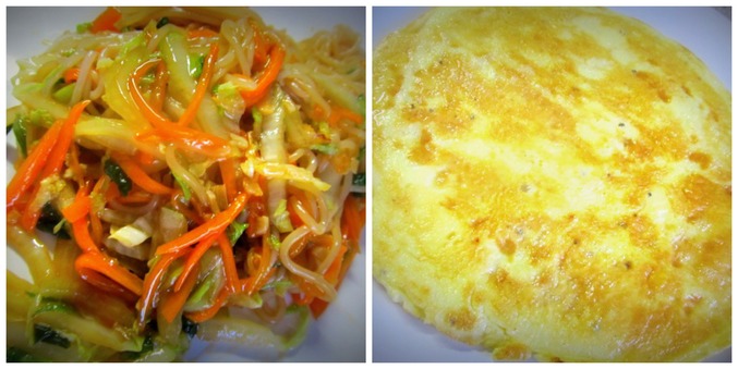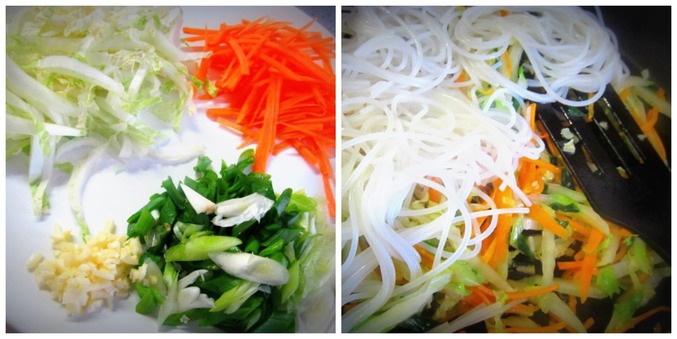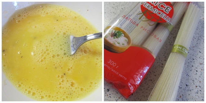 * Для омлета взбиваем вилкой яйца с солью и перцем. Рисовую лапшу отвариваем не до готовности в течении двух минут, она будет продолжать готовиться вместе с овощами.