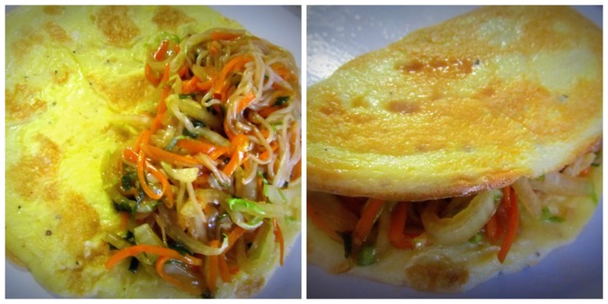 * Выкладываем начинку на половину омлета, а второй половиной накрываем.