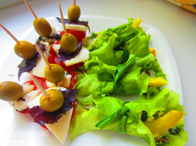 Начинка: адыгейский сыр размять вилкой, добавить чеснок порубленный, зелень-кинза, укроп, петрушка, редиску,перчик порезанные соломкой, посолить немного, чуть взбрызнуть маслом( я беру нерафинированное). Хорошо перемешать. Положить начинку на листик салата, завернуть и завязать луком зеленым или завернуть в виде мешочка.