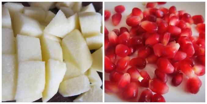 Яблоко очистить и нарезать кубиками. Подготовить зёрна граната.