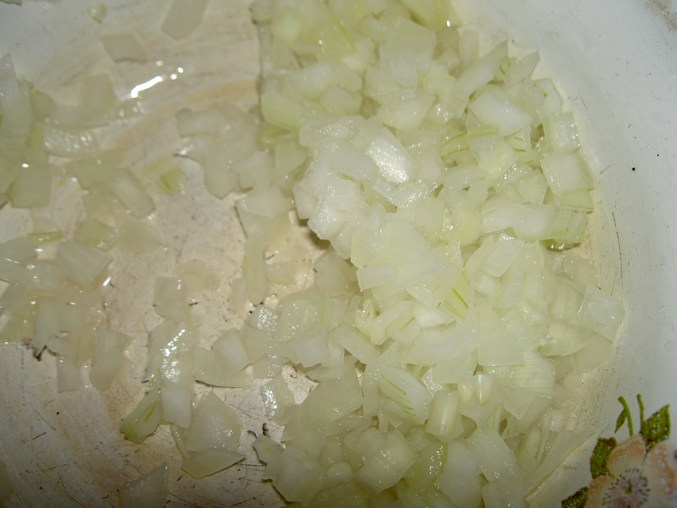 Лук мелко нарезать и залить кипятком минут на 10-20, затем воду слить и промыть лук в холодной воде.