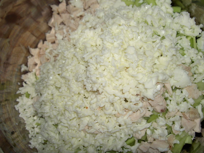 Куриное филе отварить до готовности, яйца отварить. Сырой картофель натереть на терке (я терла на терке для корейской моркови) и обжарить во фритюре. Советую обжаривать небольшими порциями, иначе картофель может слипнуться, а нам нужен рассыпчатый.
