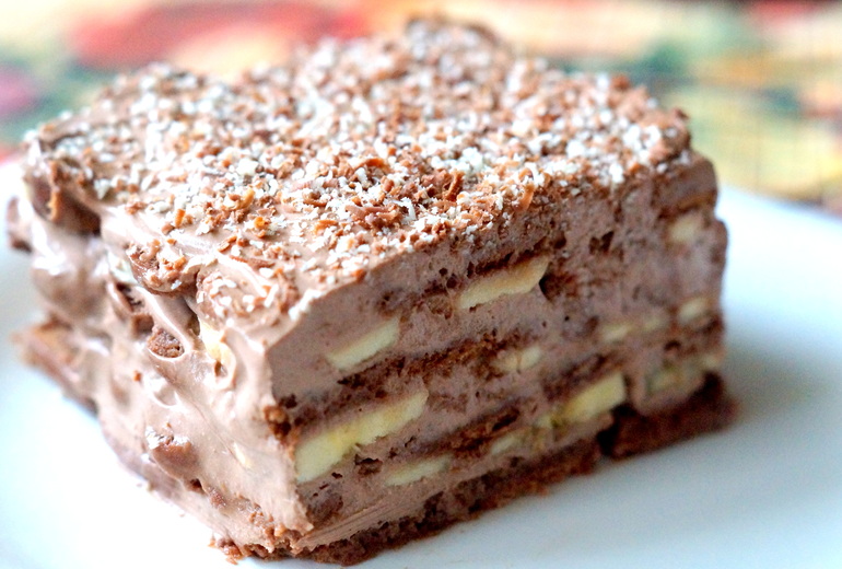 Пропитывалось это шоколадно-банановое чудо у нас всю ночь. Из холодильника потом мы вытащили удивительно нежный, тающий во рту десерт! Ник обалдел от вкуса и уплетал торт на завтрак, обед и ужин. Даша отнеслась к произведению рук своих осторожно - особо не ела, больше ковырялась.