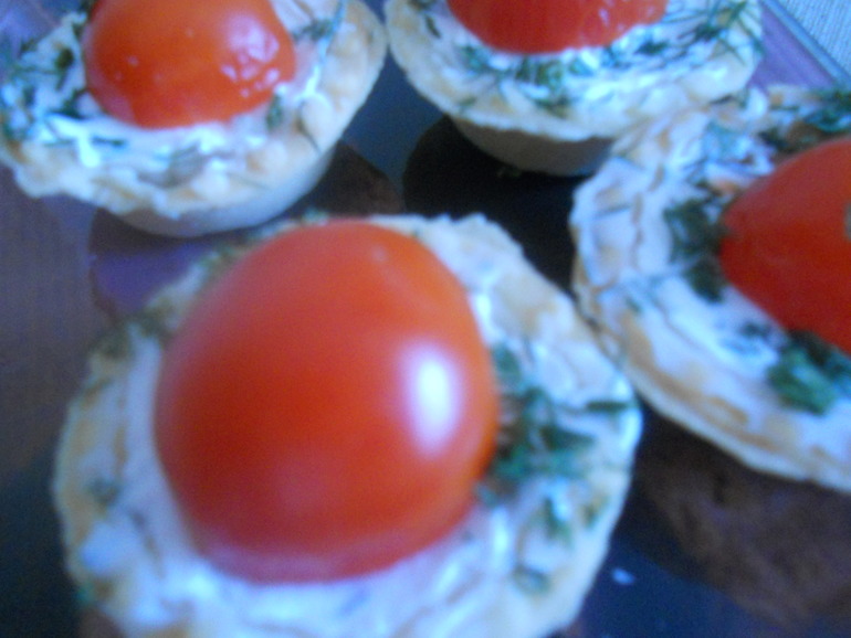 Тарталетки с картофелем и сыром/ крем чиз с зеленью (специями по вкусу) и помидорами черри