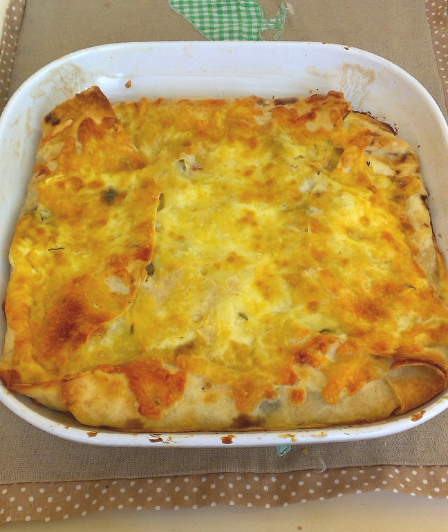 На лаваш в форме выложить часть сыра, порезанную зелень, закрыть лоскутками смоченного в кефире лаваша, затем опять сыр, зелень, лаваш. Чередовать пока не закончатся ингредиенты, у меня 2-3 слоя обычно выходит.