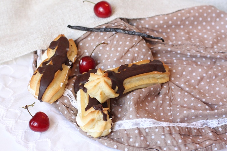 8. Готовые эклеры разрешать вдоль с одной стороны и наполнить заварным кремом, сверху полить шоколадной глазурью (я часто использую покупную