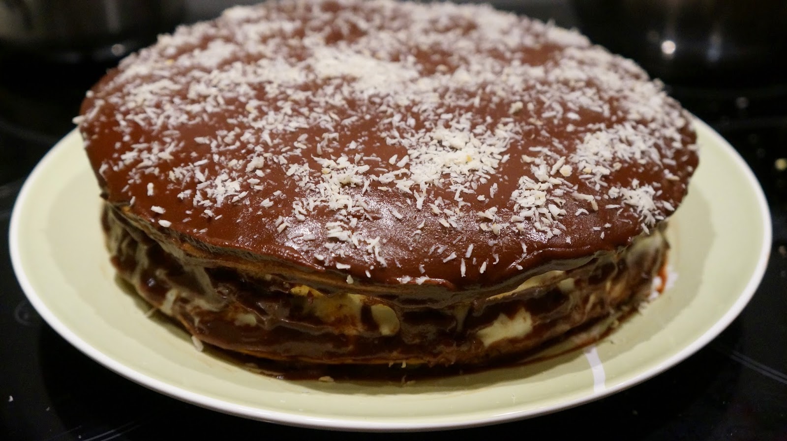 Первый корж смазываю кремом сыплю крошкой, снова кремом, накрываю другим коржом. Снова крем-крошка-крем. И так на каждый. Покрываю свареной глазурью. Здесь на фото лучше видно, как глазурь должна "ноздриться" о чем я писала в торте с мастикой. Посыпаю кокосовой стружкой, можно шоколадку потереть, можно посыпкой для куличей. И все готово. Еще один тортик за один час.