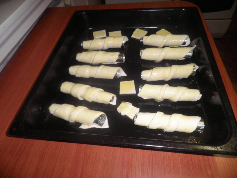 Тесто разрезать на полоски , намотать на конусы( если нет конусов сделайте их из картонной бумаги) и выпекайте. Наполните кремом и посыпте сахарной пудрой, если нет желания делать крем, то можно с сгущенкой.