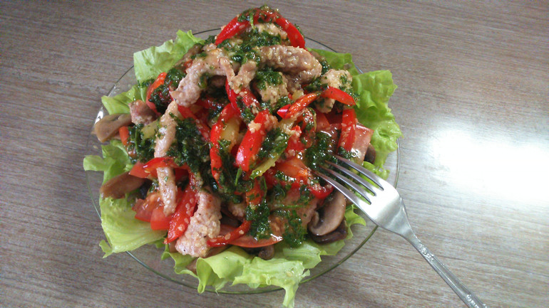 На дно тарелки выкладываем листья салата, затем жареные грибы, затем, помидоры, далее мясо с перцем и поливаем все это дело сверху соусом.
