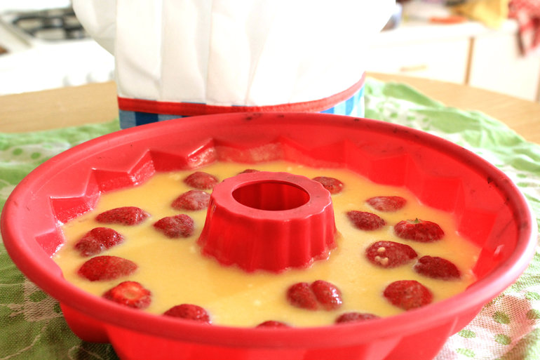 Выкладываем в форму клубнику. Клубнику лучше брать больше, потому что в процессе готовки ребенок съест половину.