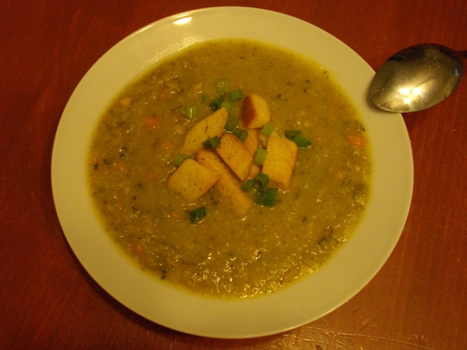 В общем, на этот суп-пюре точных ингридиентов не существует, у каждой хозяйки свой любимый рецепт. Я беру: кабачок, немного брокколи, картошку, белую фасоль, зеленый горошек сухой, лук зеленый, дольку чеснока, морковь. Муж еще кладет седано, но не было eго в этот раз в холодильнике))) Все моется, нарезается и ставится вариться на 30-40 минут, пока все не разварится (т е немного больше, чем до готовности). Потом ето дело измельчается блендером, но муж не делает блендером, а перекручивает все через какую-то штучку типа мясорубки, но это не мясорубка (сфотаю потом, простите чайника, не знаю название штучки). Потому что типа в блендере, он говорит, все слишком сильно размалывается, с должна быть именно "пассата), т е с кусочками.