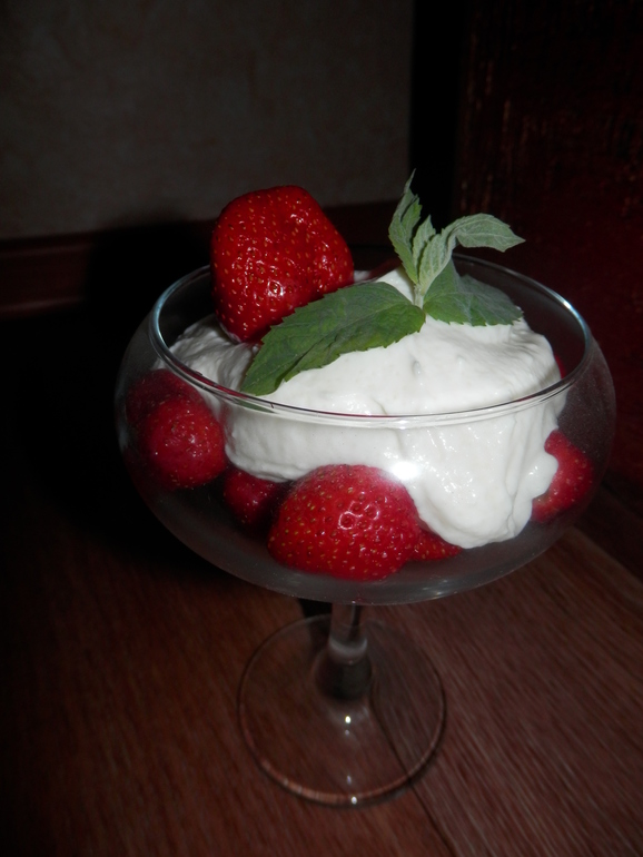 Клубнику моем, сушим, удаляем хвостики. Творог взбиваем с сахаром, сметаной и ванилином в блендере. В креманку выкладываем ягоды, сверху накрываем творогом, украшаем веточкой мяты. А теперь наслаждаемся!!!