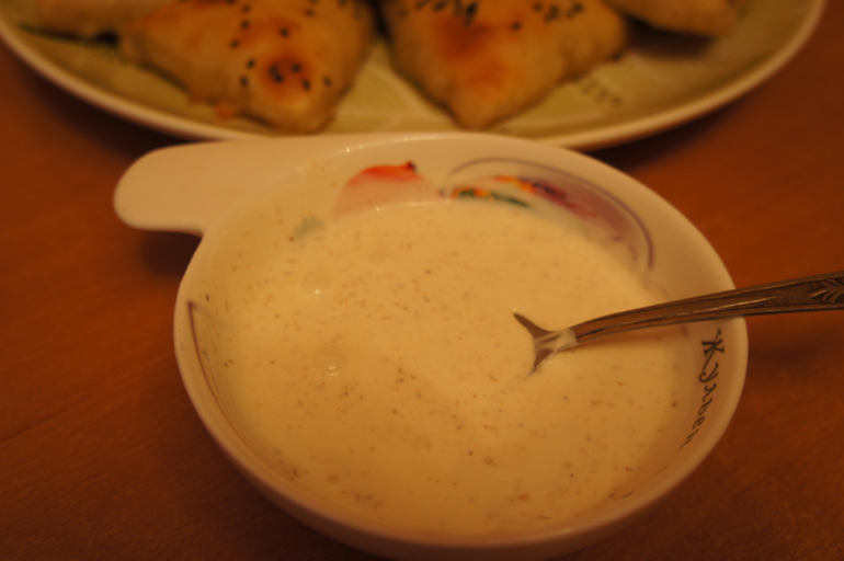 И белый соус - сметана, чеснок, приправа, соль.