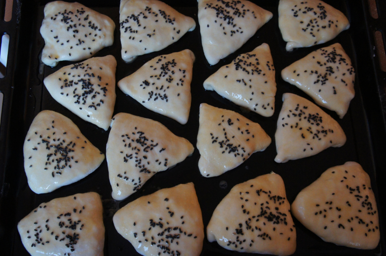 на кружок теста выложить столовую ложку фарша, кусочек сливочного масла, защипать треугольником, смазать яйцом, посыпать кунжутом.